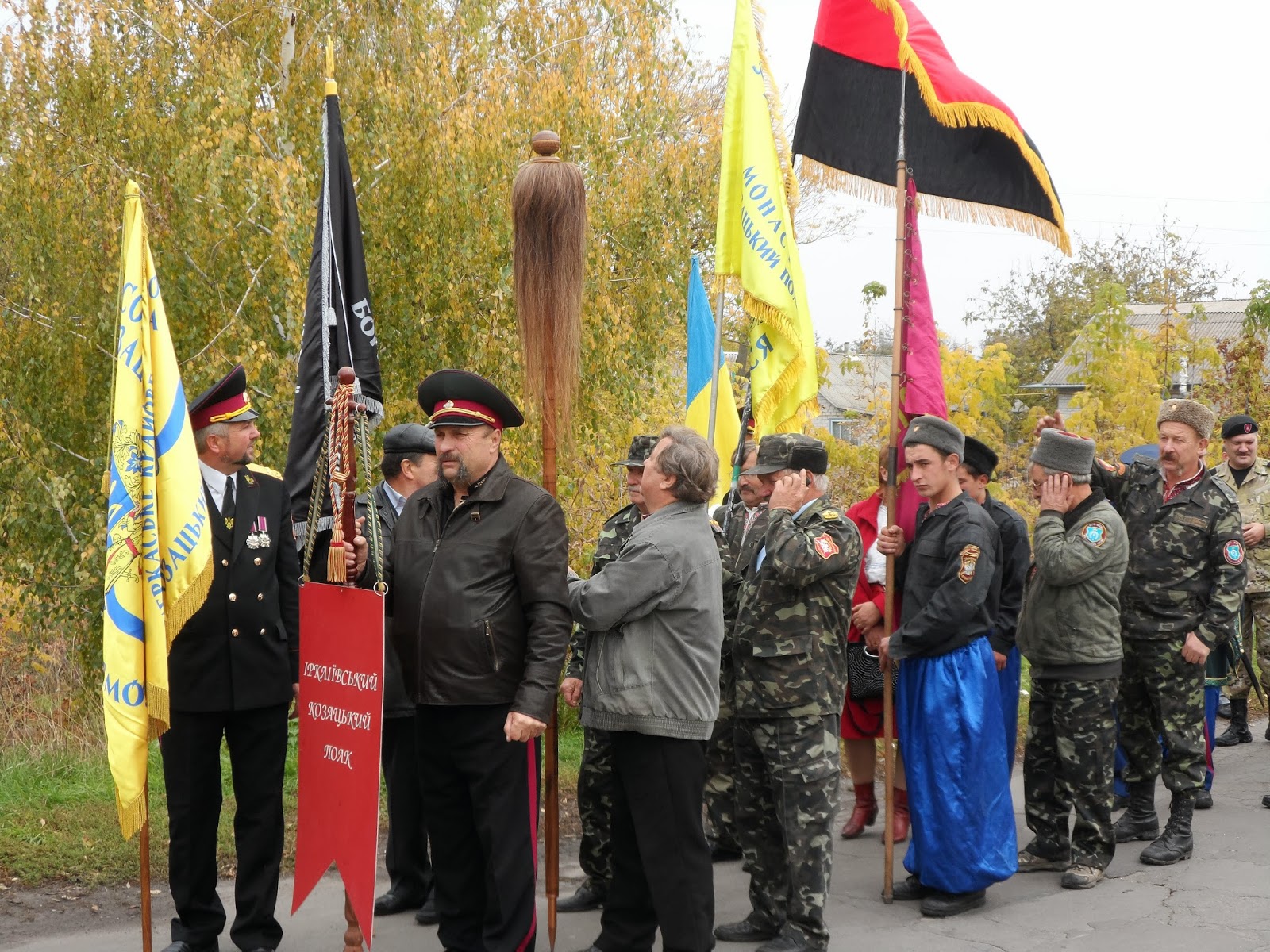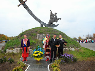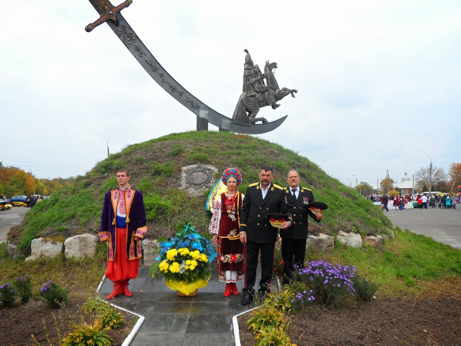 Вишикувались у шерегу біля пам’ятника, який козаки встановили таким чином. Хоча, вважається, що на коні зображено Богдана Хмельницького, на шаблі виковано цитату І.Мазепи: “Через шаблю маєм право”.